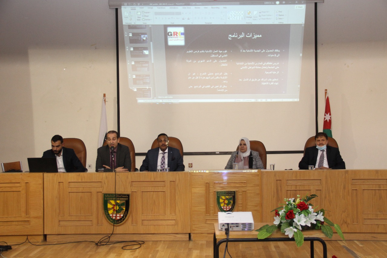 حيث قدم الدكتور عصمت محمد المحبوب المدير العام لمؤسسة الموارد البشرية -بحضور الدكتور محمد العزام المدير الإقليمي للمؤسسة والدكتوره كريمة دعبس نائب المدير العام للشؤون الخارجية وعميد كلية الأمير عبدالله بن غازي للاتصالات وتكنولوجيا المعلومات الدكتور خلف الختاتنه- شرحا تفصيلا عن الاتفاقية الموقعة مع الجامعة والهدف منها والذي يعود بالنفع على الطلبة والجامعة والمؤسسة من خلال تزويد الطلبة بالدورات التدريبية اللازمة التي ستعقدها المؤسسة للطلبة لتزويدهم ببعض المهارات التي يحتاجها سوق العمل الألماني بالإضافة إلى دورات في اللغة الألمانية على أيدي خبراء ألمان في هذا المجال.