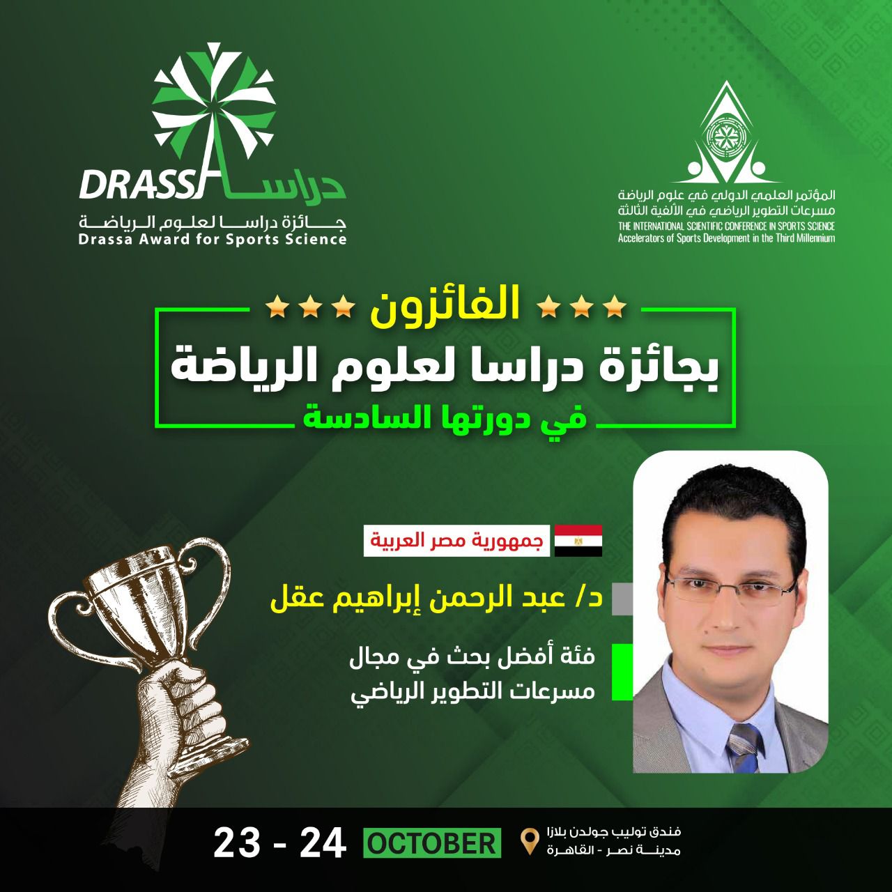كما فاز معها في هذه الفئة بالمناصفة الدكتور عبد الرحمن إبراهيم عقل من جمهورية مصر العربية عن بحث بعنوان " التنبؤ بالفوز والخسارة ودرجة حساسية السمات في بطولة كأس العالم لكرة القدم 2018 باستخدام تحليل الشبكات العصبية الاصطناعية "