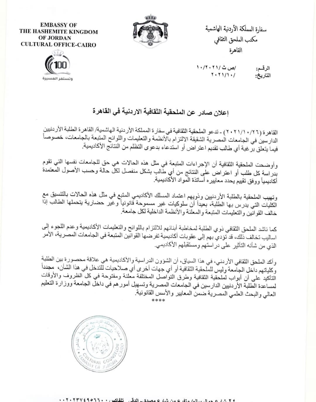 القاهرة (26/10/2021) - تدعو الملحقية الثقافية في سفارة المملكة الأردنية الهاشمية/ القاهرة الطلبة الأردنيين الدارسين في الجامعات المصرية الشقيقة الالتزام بالأنظمة والتعليمات واللوائح المتبعة بالجامعات، خصوصاً فيما يتعلق برغبة أي طالب تقديم اعتراض أو استدعاء بدعوى التظلم من النتائج الأكاديمية.