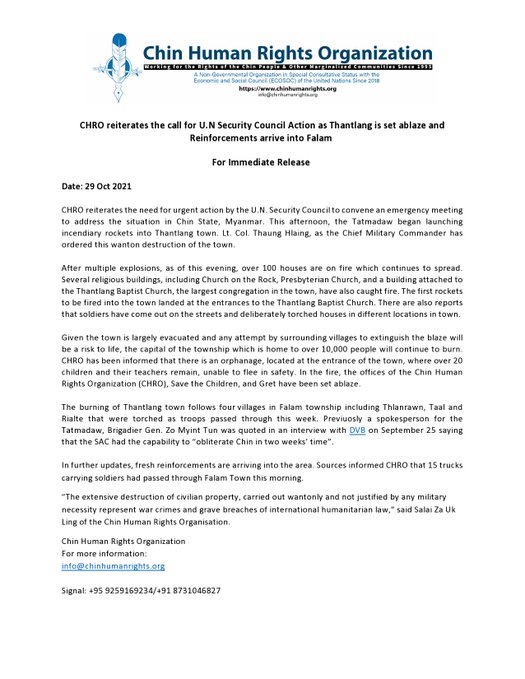 وتقول منظمة "بروسيكيوشن" أو "كريسيتيان كونسيرن الدولية" المعنية بحقوق الأقليات المسيحية إن بلدة ثانتلانغ التي يقطنها نحو 10 آلاف من قومية تشين باتت خالية بعد أن هجرها السكان إلى الأرياف والمدن الأخرى، مما يجعلها عرضة لمزيد من الحرائق، كما أن هناك حاجة إلى معونات غذائية وطبية لآلاف النازحين في الولاية.