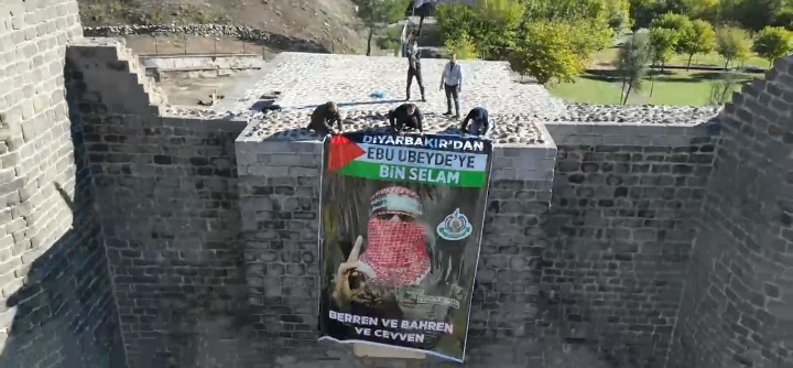 عاجل /رفع صورة الناطق باسم كتائب القسام أبو عبيدة على قلعة أثرية في ديار بكر التركية.
