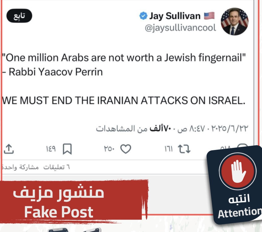 نفي تداول منشور "مليون عربي لا يساوي ظفر يهودي" المنسوب لسيناتور أمريكي مزعوم