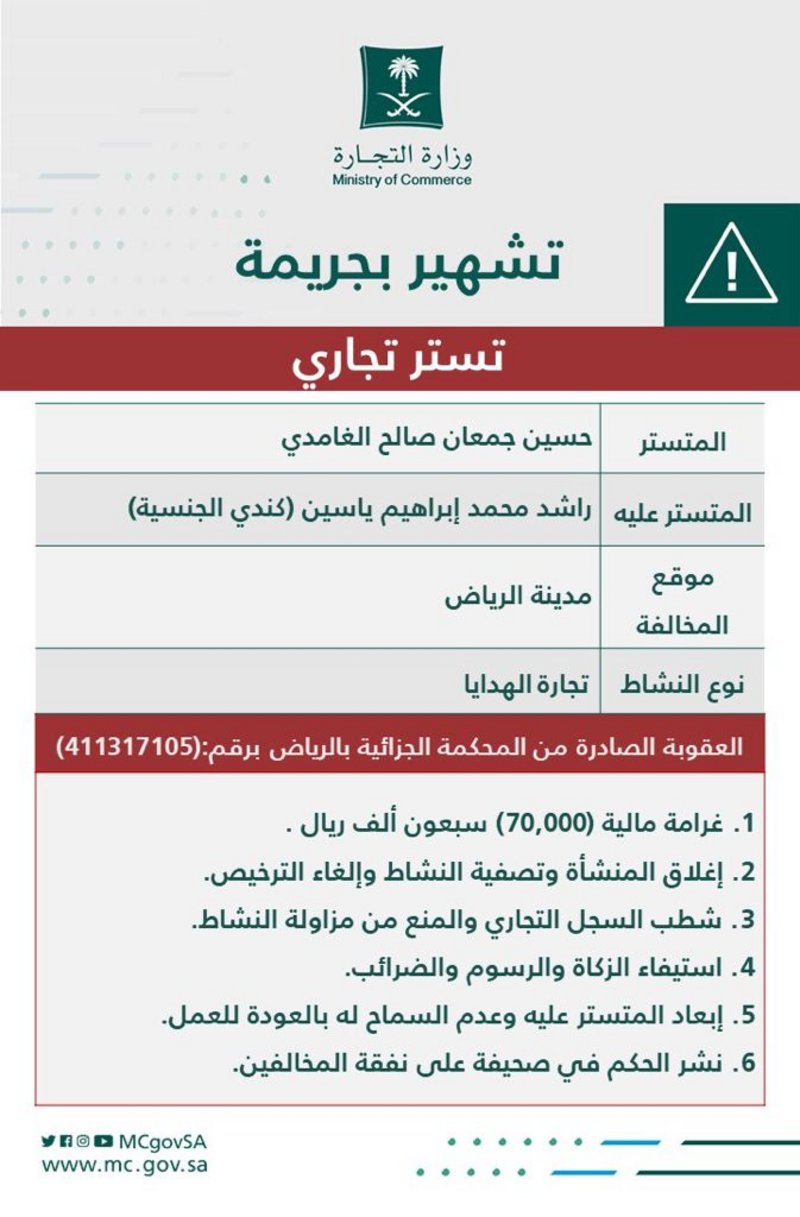 "السعودية" التجارة" تُشهِّر بمواطن سعودي ومقيم كندي أدينا بجريمة التستر التجاري