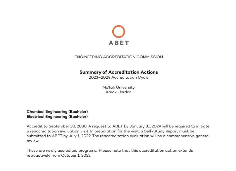 جامعة مؤتة : كليه الهندسة تحصل على شهادة الاعتماد الدولي ABET