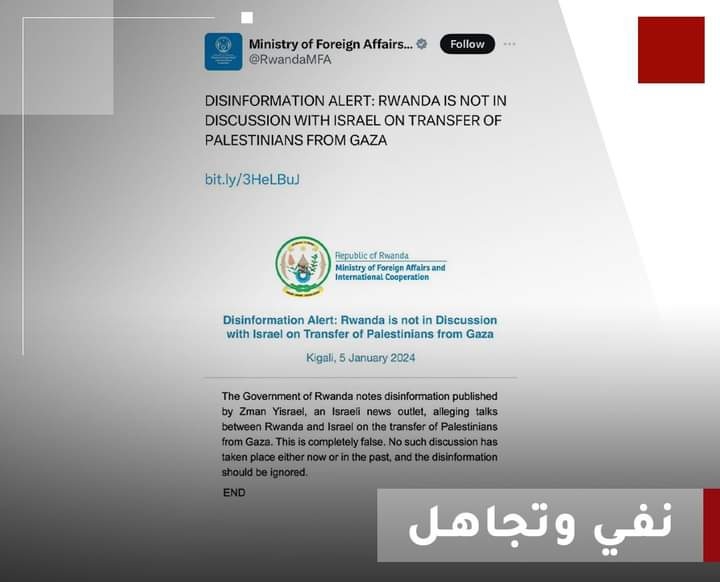 حكومة رواندا تنفي عبر صفحتها الرسمية بموقع "إكس" وجود مباحثات مع إسرائيل تتعلق بـ"هجرة طوعية" لسكان غزة