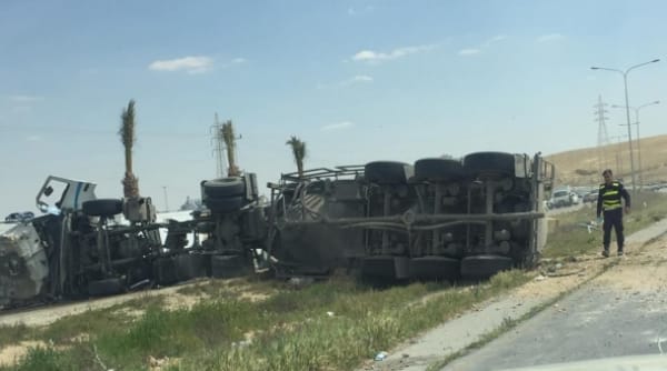تدهور صهريج محملا بالإسمنت عند تقاطع كفرخل باتجاه عمان