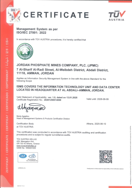 الفوسفات" تحصل على شهادة "الآيزو" في نظام إدارة أمن المعلومات