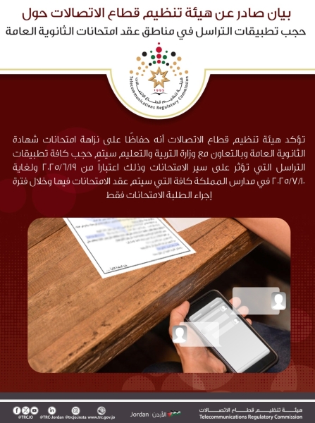 حجب تطبيقات التراسل في مناطق عقد امتحانات الثانوية العامة