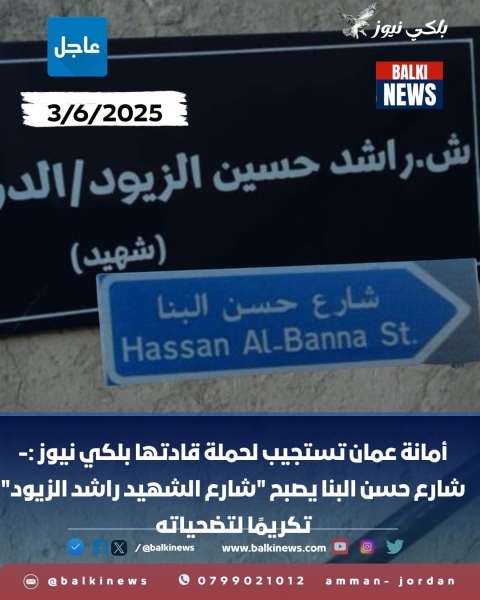 أمانة عمان تستجيب لحملة قادها موقع بلكي نيوز :- شارع حسن البنا يصبح "شارع الشهيد راشد الزيود" تكريمًا لتضحياته