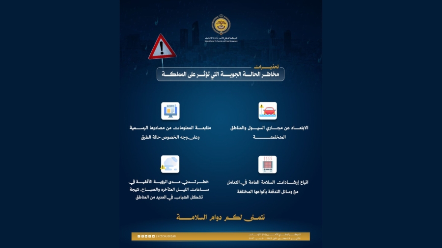 مركز الأزمات يدعو لتوخي الحيطة والحذر مع الحالة الجوية