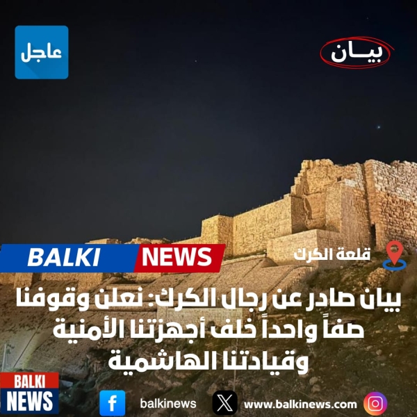عاجل - بيان صادر عن رجال الكرك: نعلن وقوفنا صفاً واحداً خلف أجهزتنا الأمنية وقيادتنا الهاشمية