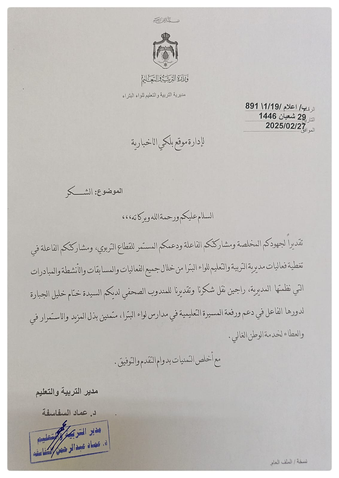 مديرية التربية والتعليم للواء البتراء تشكر موقع بلكي الإخباري على تغطية فعالياتها
