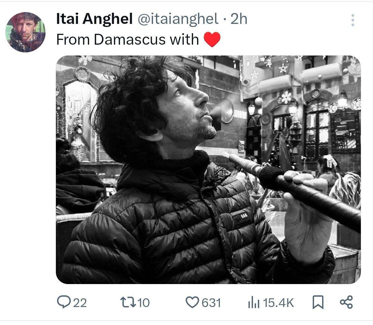 عاجل - صحافي إسرائيلي يدخّن النرجيلة في دمشق... ويعلّق (صورة)