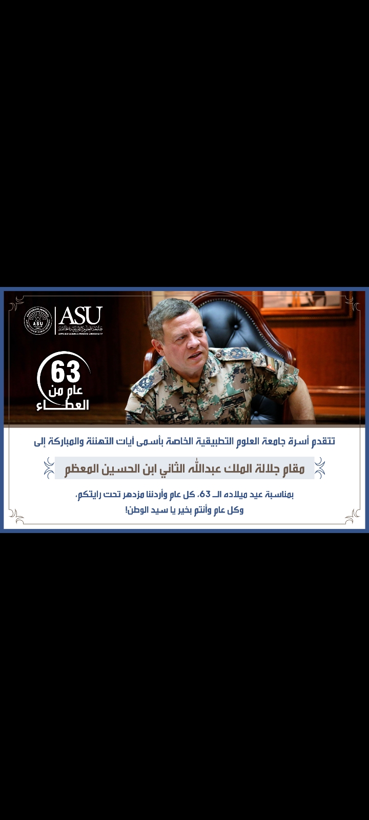 جامعة العلوم التطبيقية الخاصة تهنئ جلالة الملك عبدالله الثاني بمناسبة عيد ميلاده الميمون…