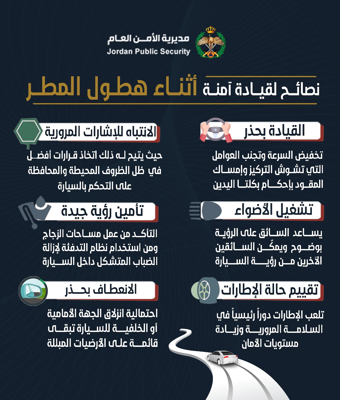 الأمن العام يدعو لأخذ أقصى درجات الحيطة والحذر على الطرقات خلال تساقط الأمطار