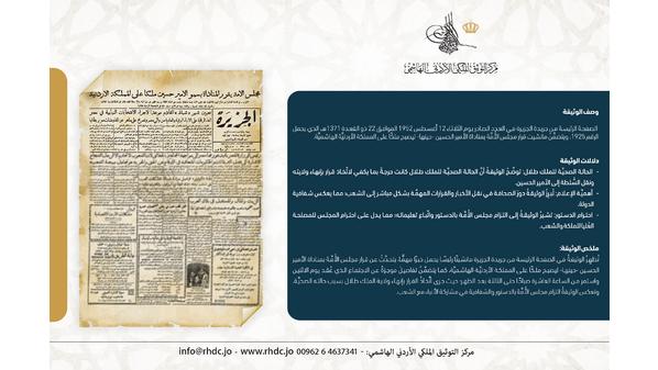 التوثيق الملكي يعرض وثيقة في ذكرى تنصيب الملك الحسين ملكًا