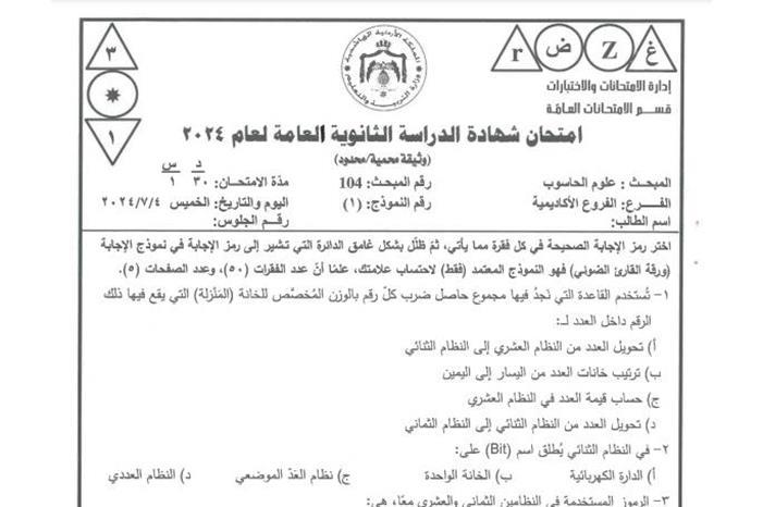 التربية تنشر أسئلة امتحان علوم الحاسوب للتوجيهي اليوم