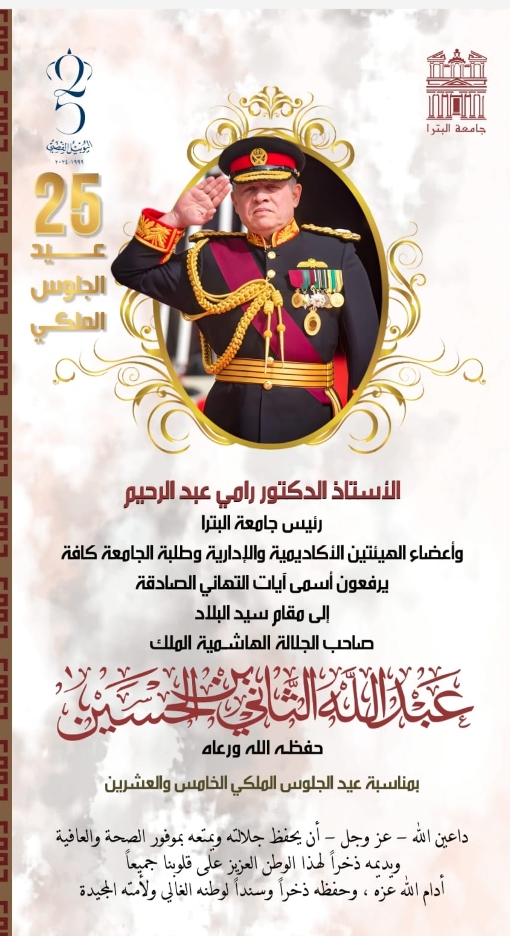 أسرة جامعة البترا تهنئ باليوبيل الفضي لجلالة الملك عبدالله الثاني