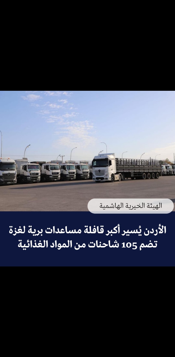 / الأردن يُسير أكبر قافلة مساعدات برية لقطاع غزة تضم اكثر من 100 شاحنة محلمة بالمواد الغذائية