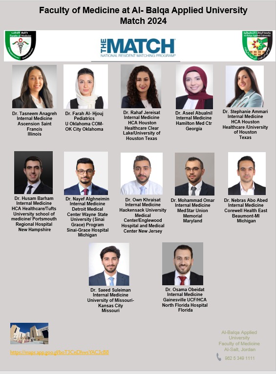 اثنا عشر طبيبا من خريجي طب البلقاء التطبيقية في " قبولات التدريب السريري في برامج الإقامة في الولايات المتحدة الأمريكية