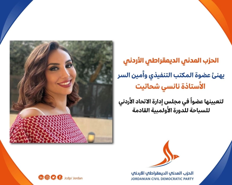 الحزب المدني الديمقراطي الأردني يهنئ الأستاذة نانسي شحاتيت لاختيارها عضواً في مجلس إدارة اتحاد السباحة