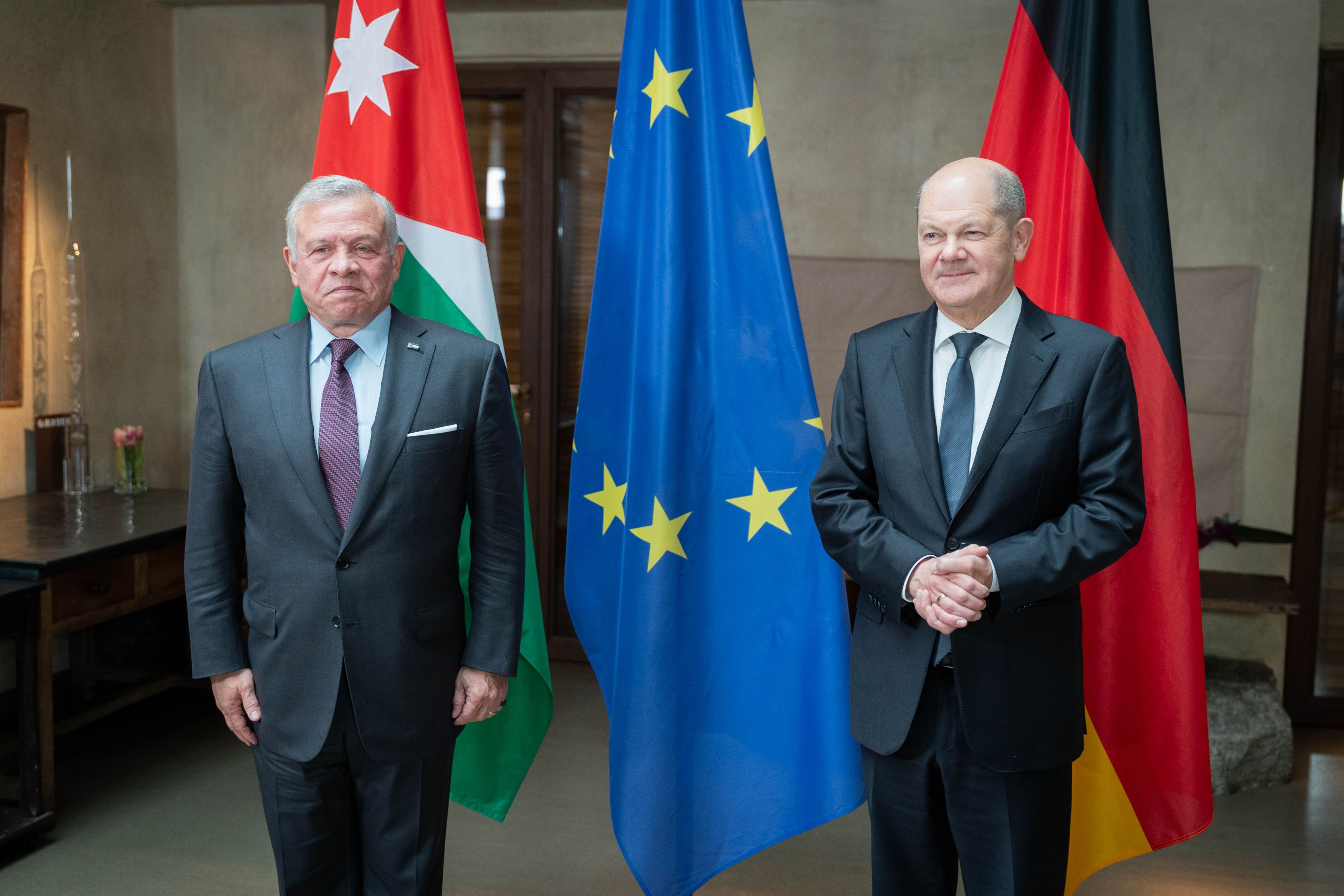 الملك يؤكد للمستشار الألماني ضرورة تكثيف الجهود الدولية لوقف إطلاق النار بغزة