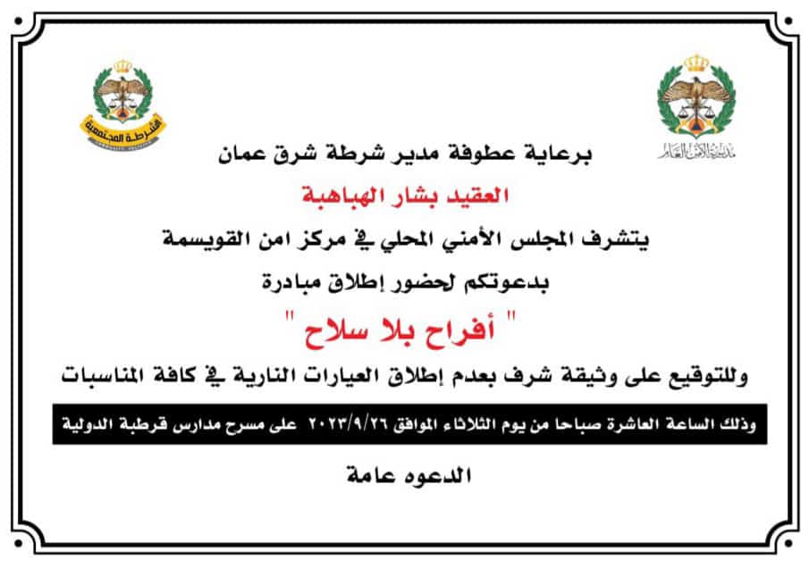 المجلس الأمني المحلي في مركز امن القويسمة يدعو المواطنين للمشاركة في توقيع وثيقة منع إطلاق العيارات النارية
