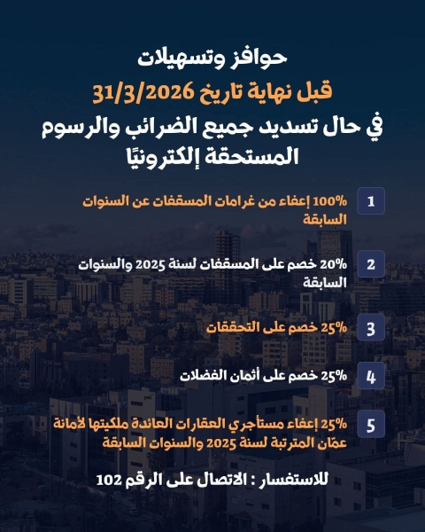 أمانة عمان حوافز وتسهيلات على تسديد جميع الضرائب والرسوم المستحقة الكترونيا