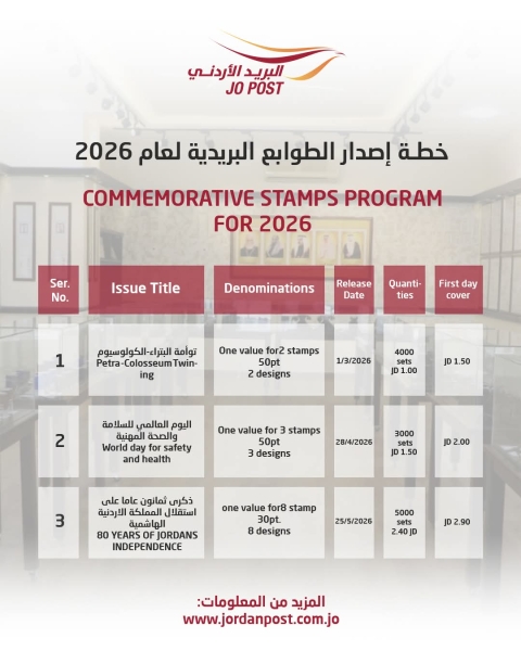البريد الأردني يعلن عن خطة إصدارات الطوابع التذكارية لعام 2026 .