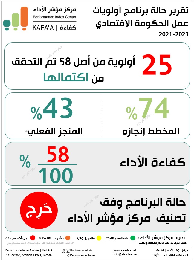 عاجل / مركز مؤشر الأداء: برنامج أولويات عمل الحكومة بالمستوى الحرج و 58% معدل الإنجاز