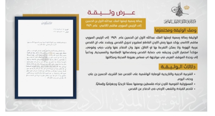 التوثيق الملكي" يعرض وثيقة حول موقف الأردن الراسخ تجاه فلسطين