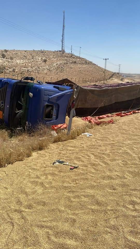 انقلاب شاحنة محملة بالقمح على اوستراد الزرقاء جابر