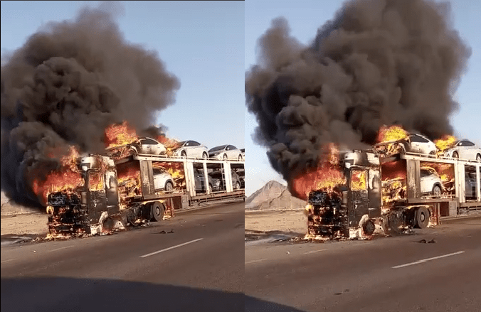 إندلاع حريق بمقطورة ناقلة سيارات في منطقة الراشدية بالعقبة.. فيديو.. صور
