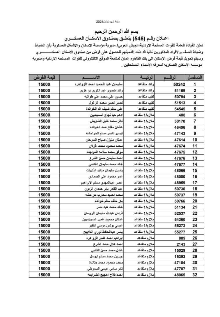 أخبار الاردن:الجيش يعلن أسماء المستفيدين من صندوق إسكان القوات المسلحة لشهر 2 (أسماء)