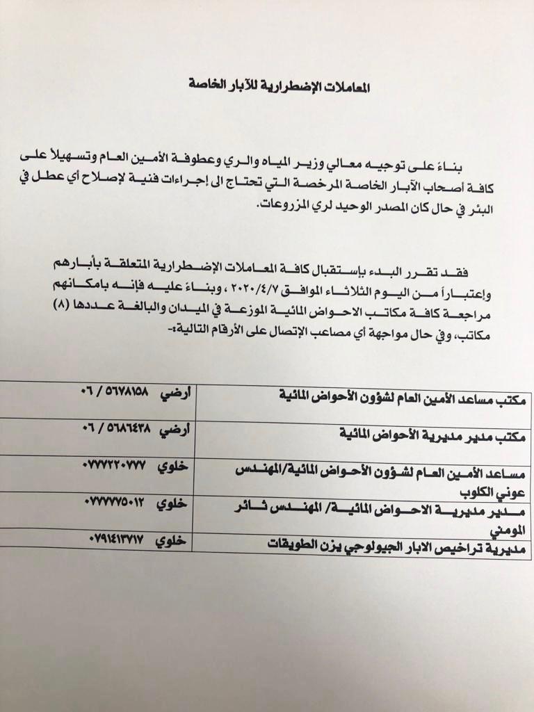 وزارة المياه والري تعلن سلسلة اجراءات لتسهيل صيانة الابار الخاصة المرخصة