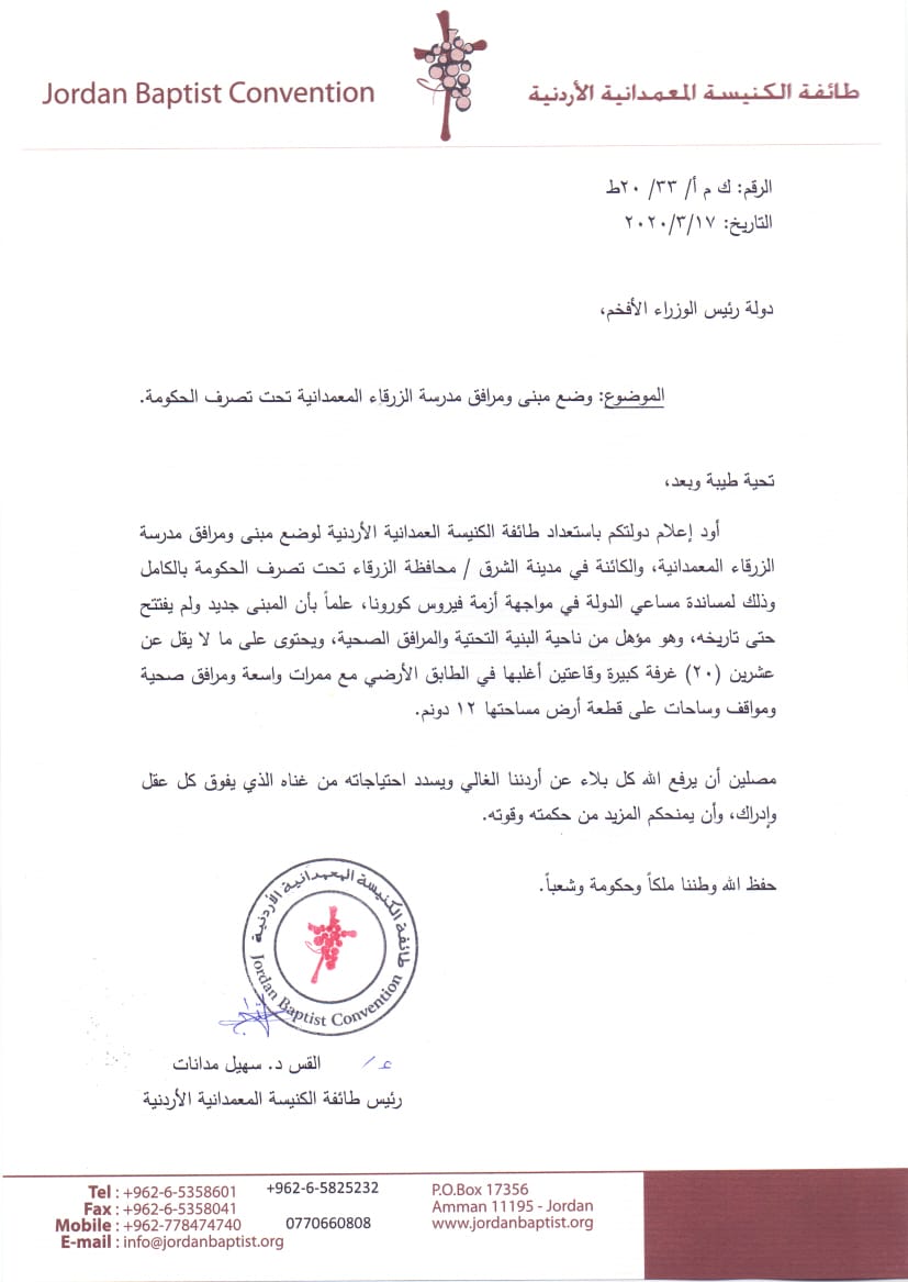 مدرسة الزرقاء المعمدانية تضع مرافقها تحت تصرف الحكومة .