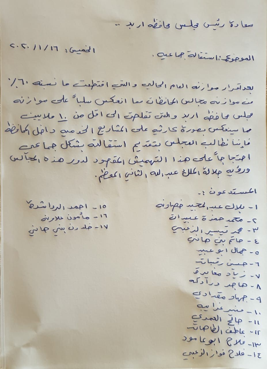 استقالات جماعية بمجلس محافظة اربد ( وثيقة )