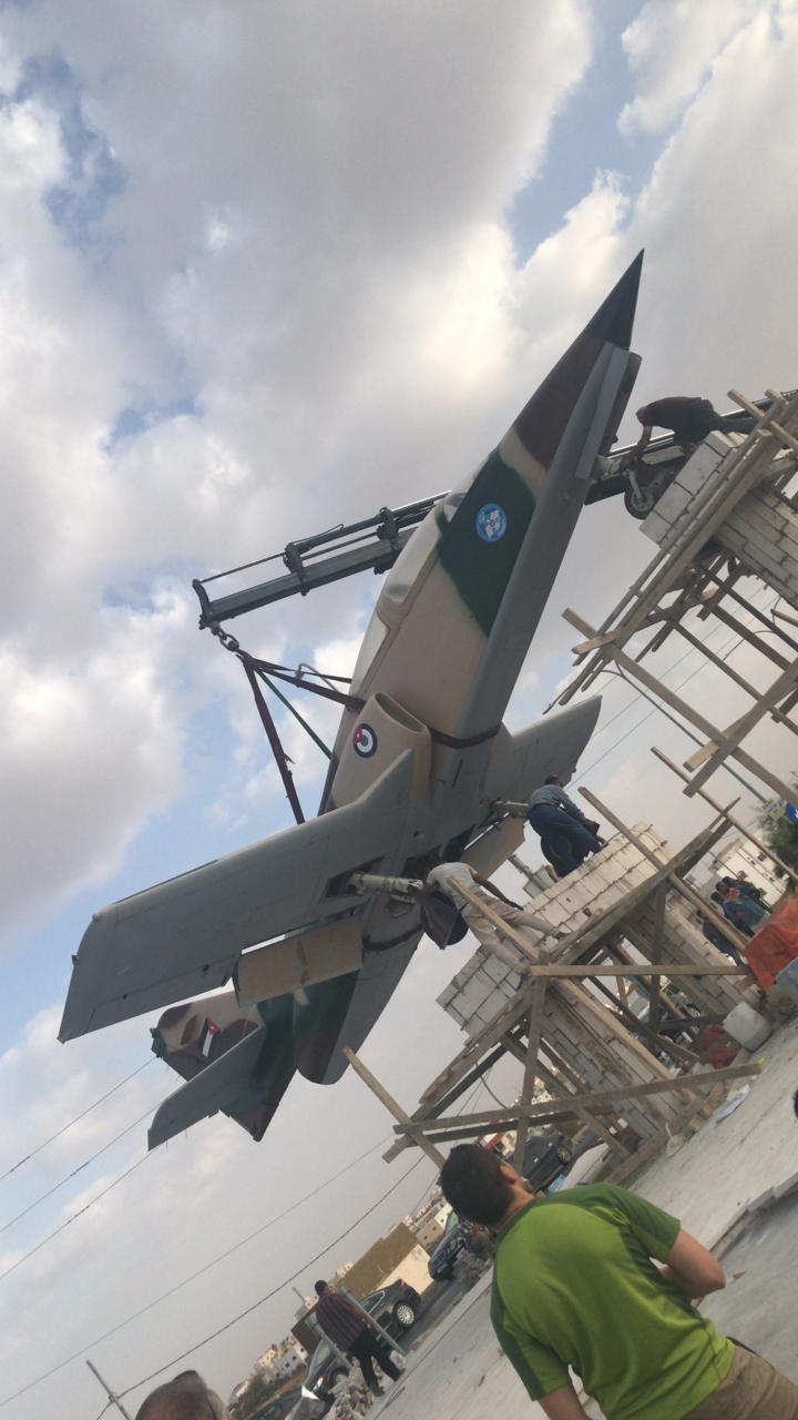 نسور سلاح الجو الأردني يقومون بتثبيت طائره لوكاسا الحربيه على دوار الشهيد الكساسبه في الكرك