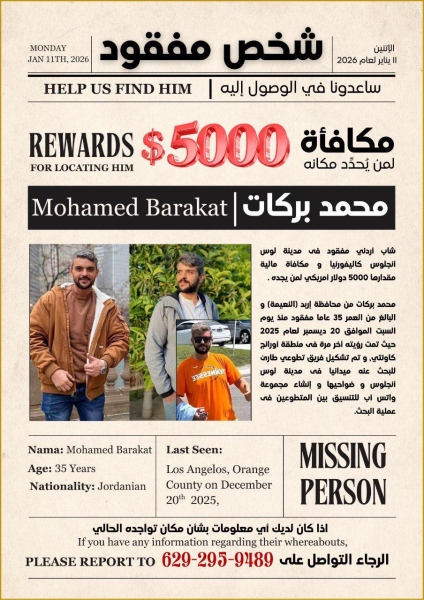 عاجل | شاب أردني مفقود فى لوس أنجلوس كاليفورنيا و مكافأة مالية مقدارها 5000 دولار أمريكي لمن يجده.