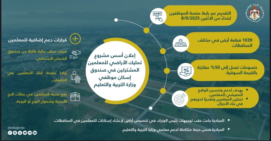 وزارة التربية تعلن أسس مشروع تمليك الأراضي للمعلمين بخصومات تصل إلى 50%