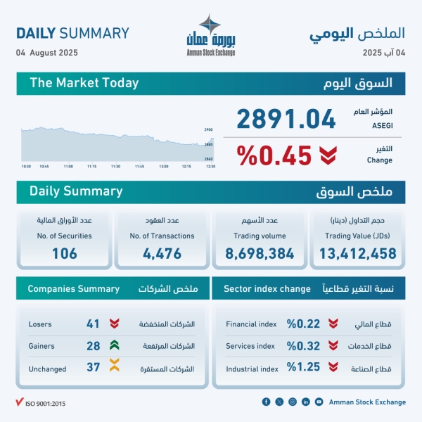 13.4 مليون دينار حجم التداول في بورصة عمان