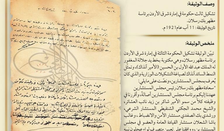 من الذاكرة : تشكيل ثالث حكومة في إمارة شرق الأردن برئاسة مظهر بك رسلان(وثيقة )