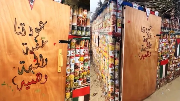 خيمة نزوح من معلبات المساعدات في غزة