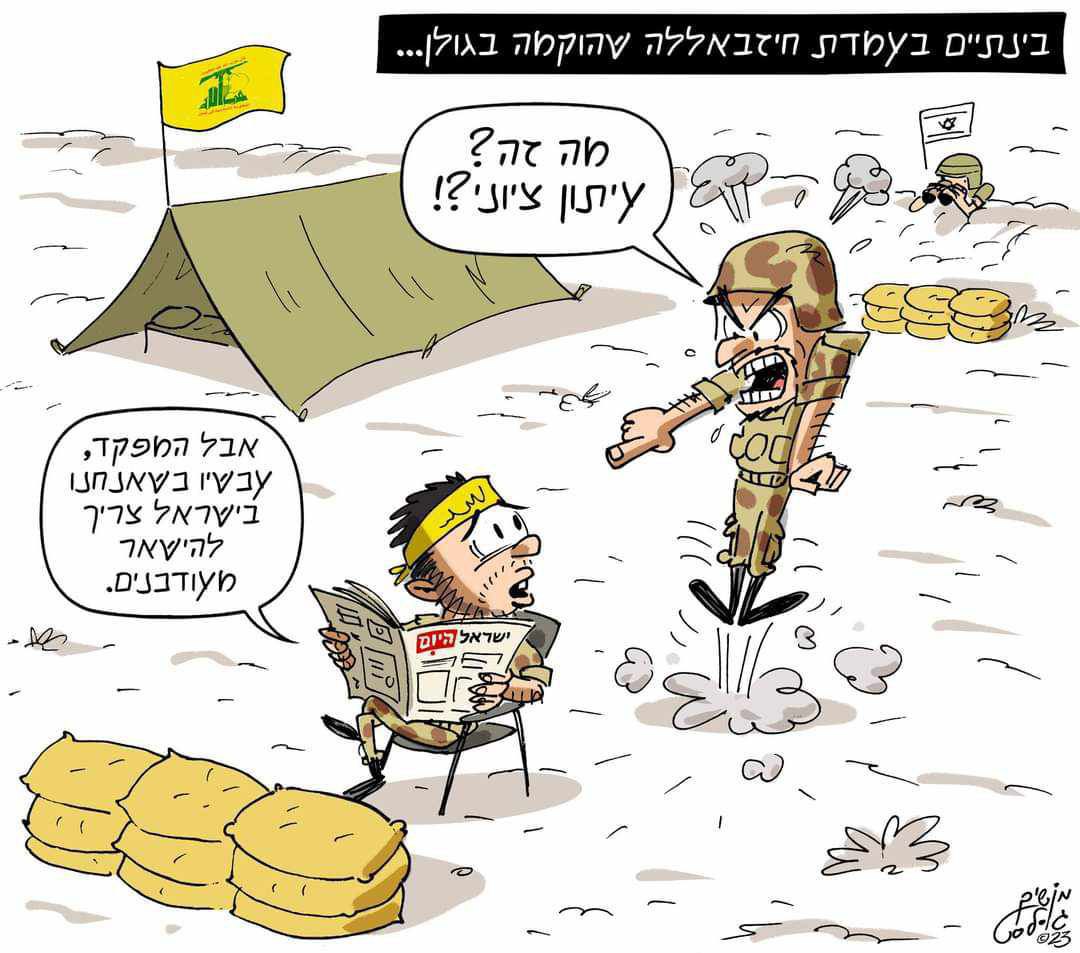 كاريكاتير لصحيفة يسرائيل هيومً حول موقع حزب الله الذي اقيم على هضبة الجولان