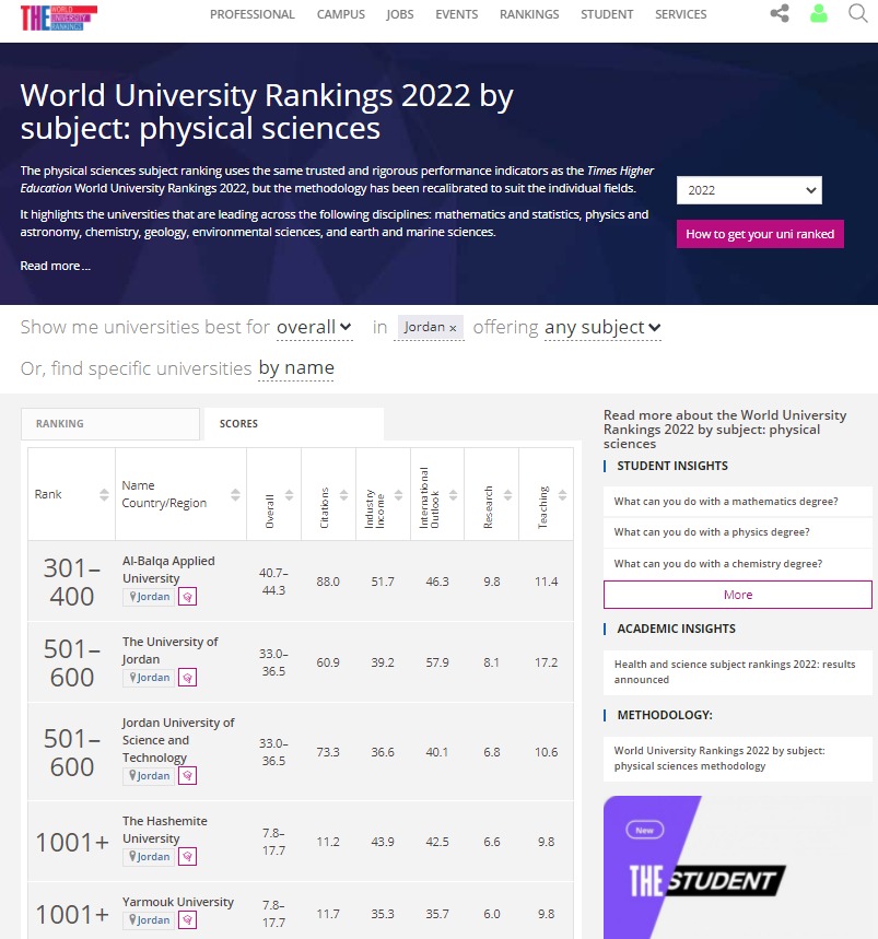 البلقاء التطبيقية ضمن الفئة (301-400) عالمياً في تصنيف التايمز للحقول العلمية بحقل العلوم الفيزيائية للعام 2022