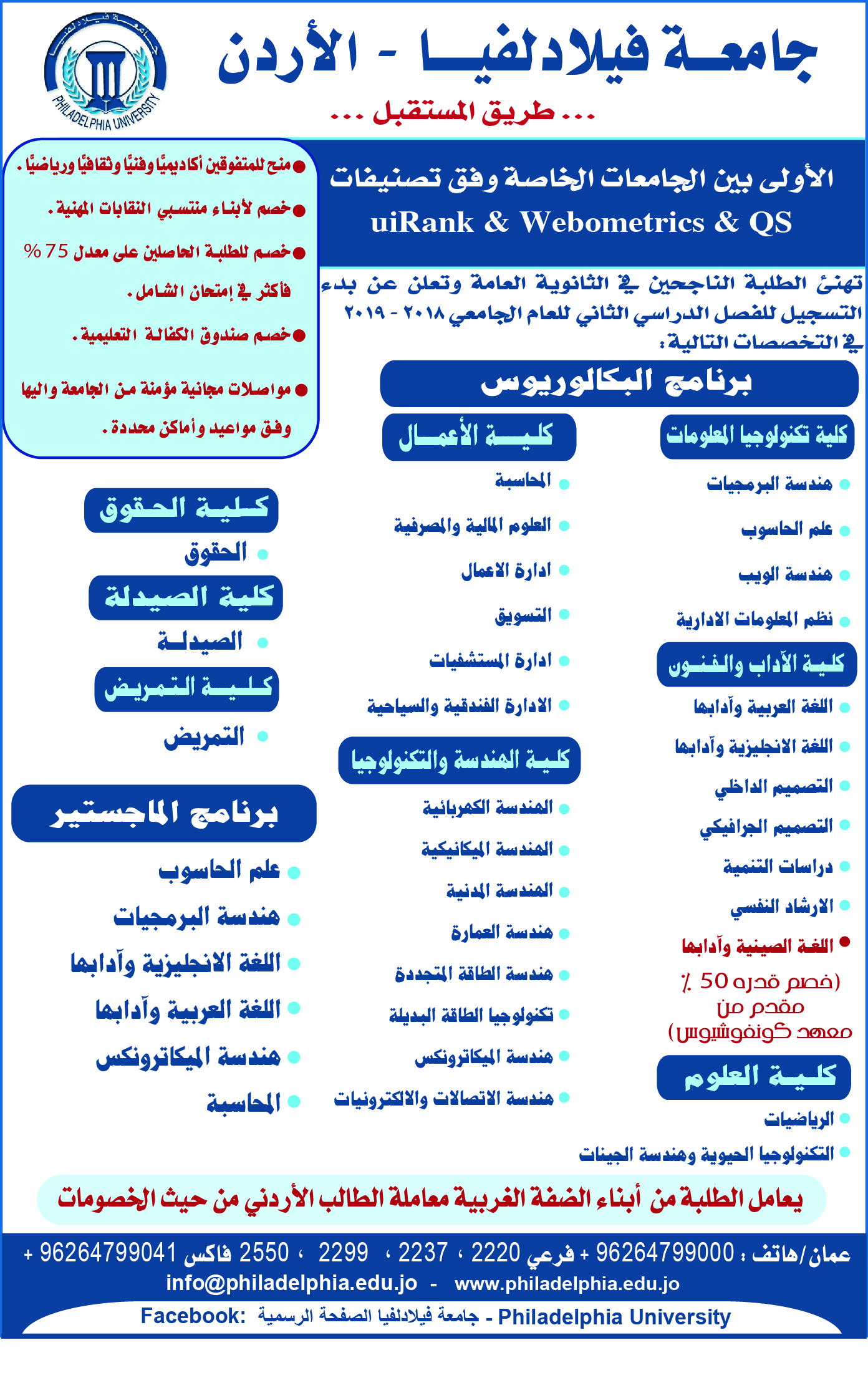 جامعة فيلادلفيا تطرح تخصصات متميزة وتفتح باب القبول والتسجيل لبرامج البكالوريوس والماجستير