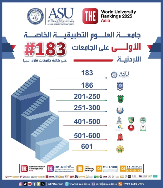 العلوم التطبيقية تتصدر الجامعات الأردنية وتحقق إنجازاً آسيوياً في تصنيف "التايمز" لعام 2025...