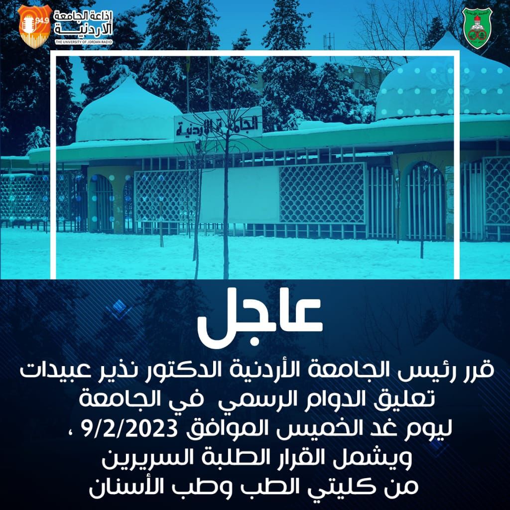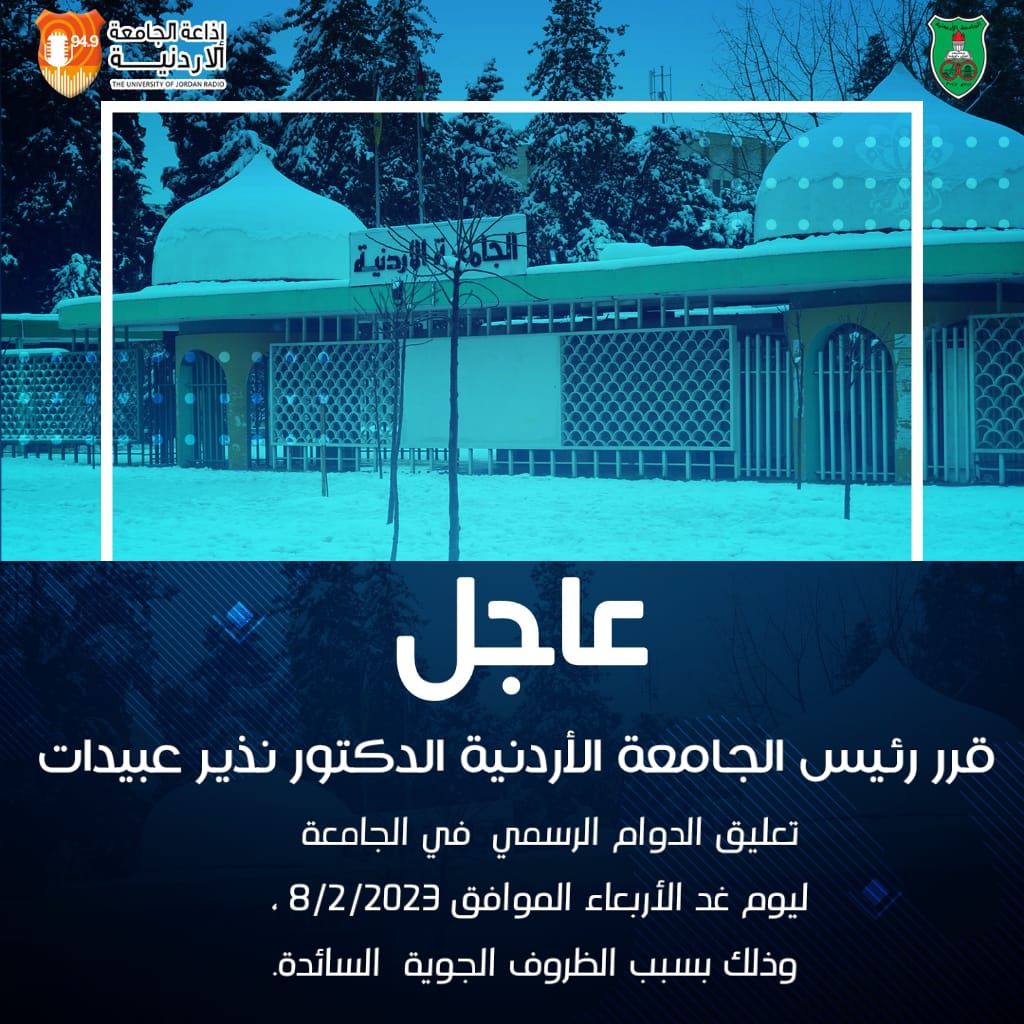 الأردنية تعلق دوام يوم غدٍ الأربعاء للعاملين والطلبة بسبب الظروف الجوية